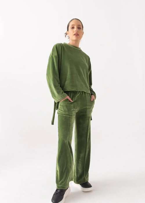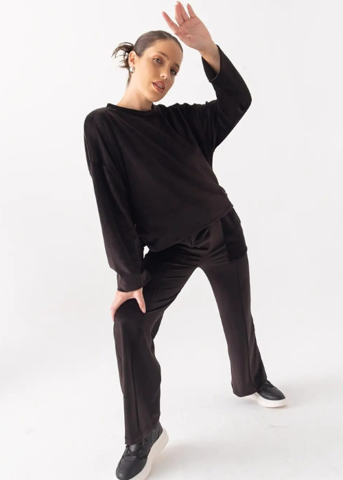 Buzo de Plush con ojalillos grandes en lateral y tira/ Pantalón de Plush, de corte recto con bolsillos palqué.